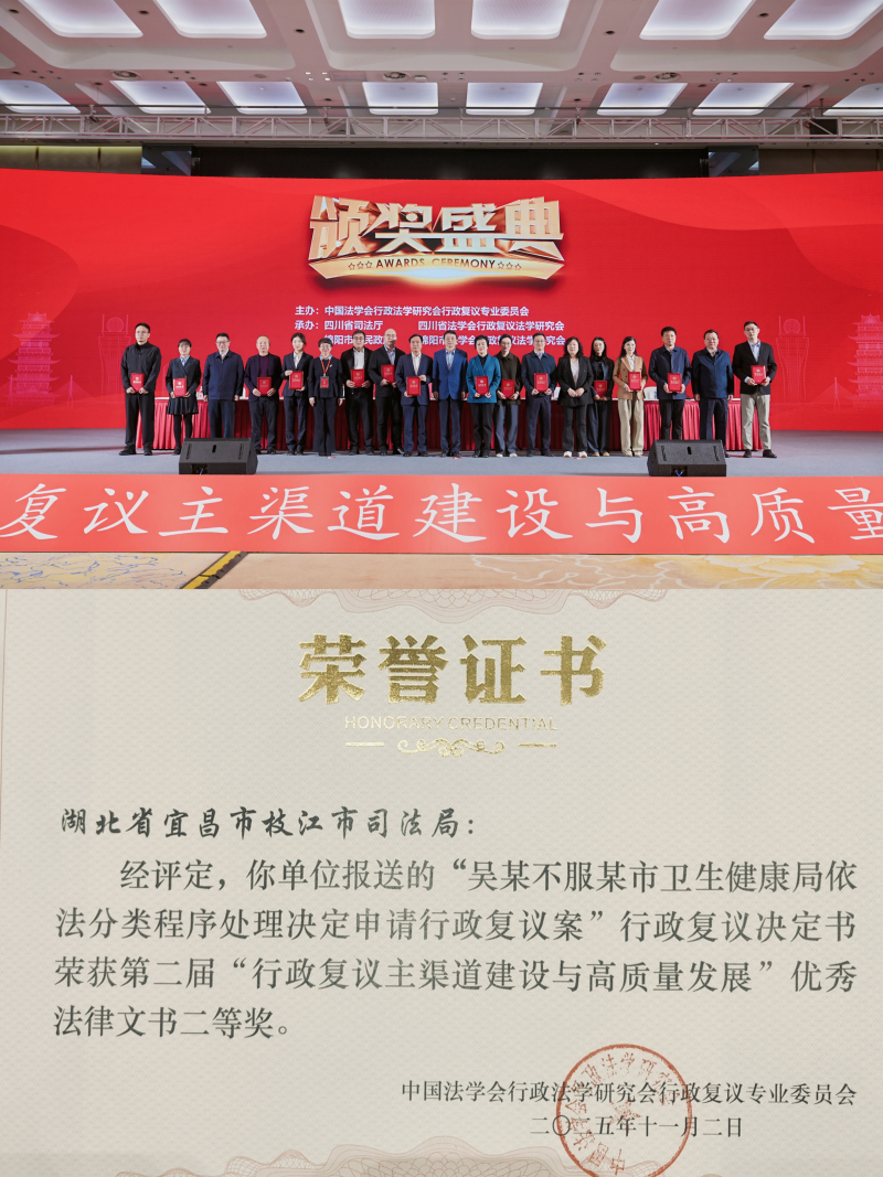 全年新收行政复议案件99件、审结98件,制发复议意见书和建议书12份,1份复议决定书获国家级优秀法律文书二等奖、入选湖北省优秀行政复议法律文书,纠错监督作用与办案质效实现双提升。出台《枝江市行政机关“一把手”出庭应诉制度》并建立“一案一评”机制,以“考核+评议”双轮驱动责任落实。全年行政诉讼案件37件,负责人出庭应诉率100%,“一把手”出庭率达50%,切实推动“出庭更出声、应诉见实效”。